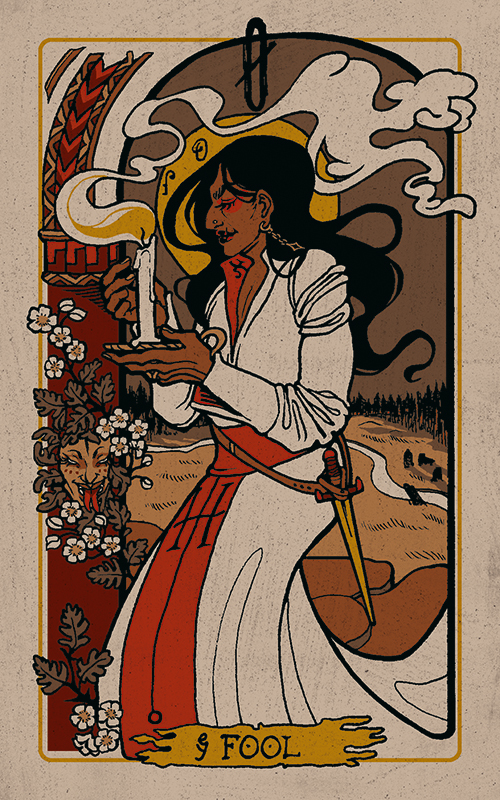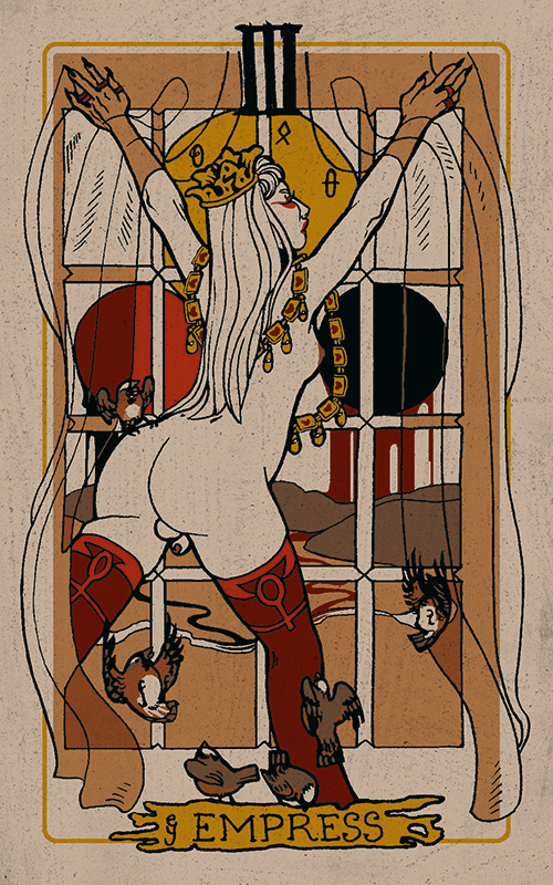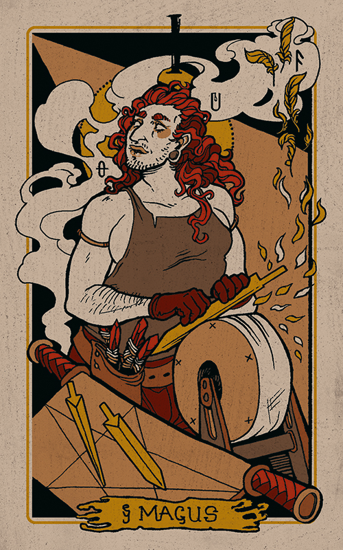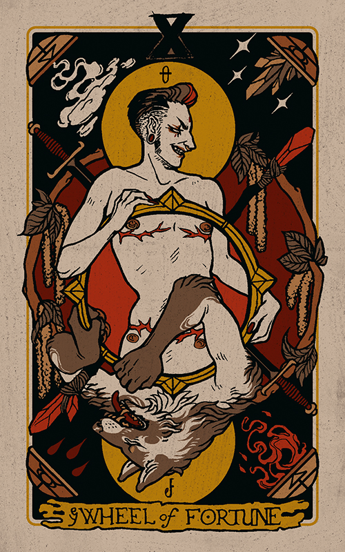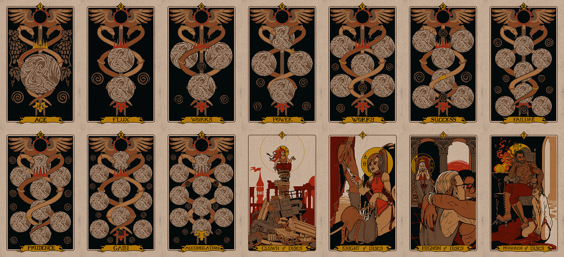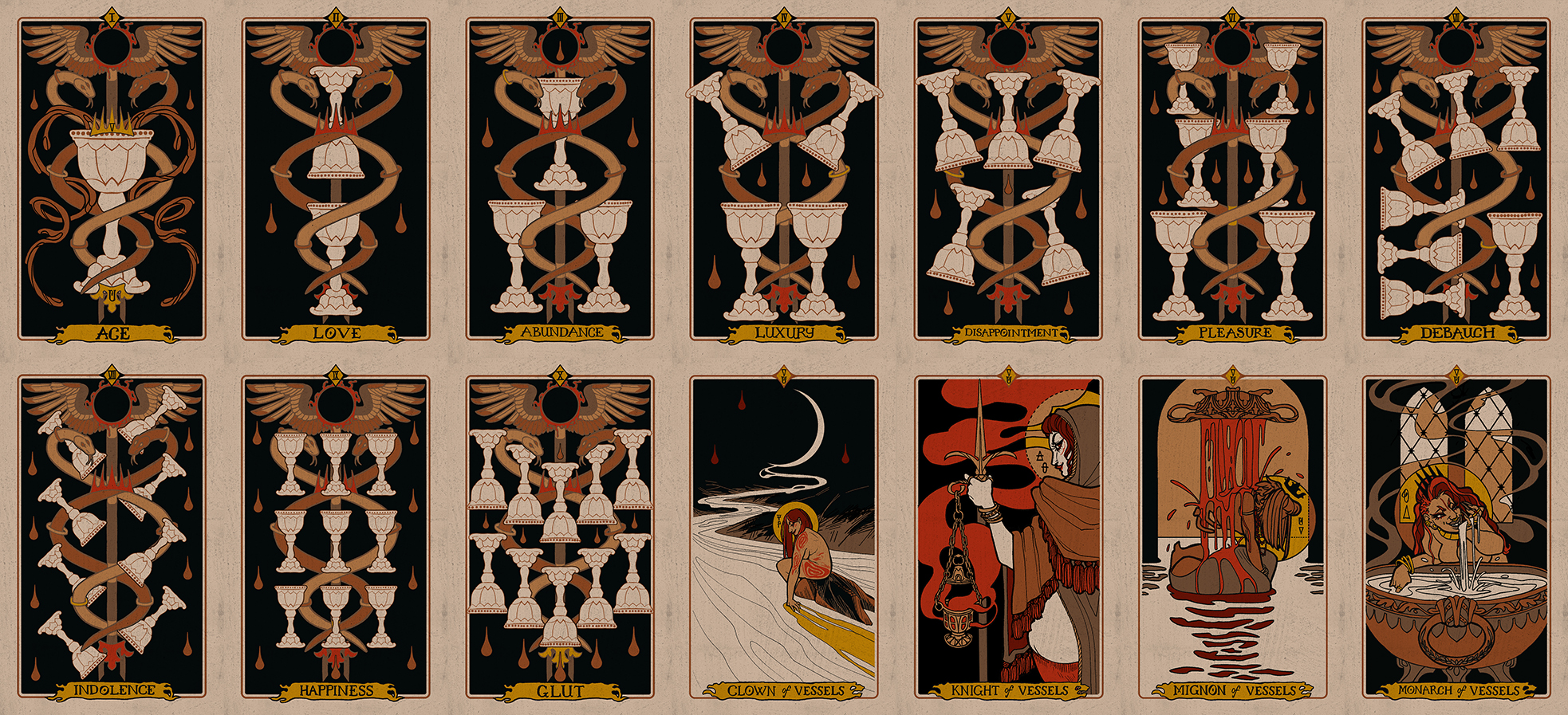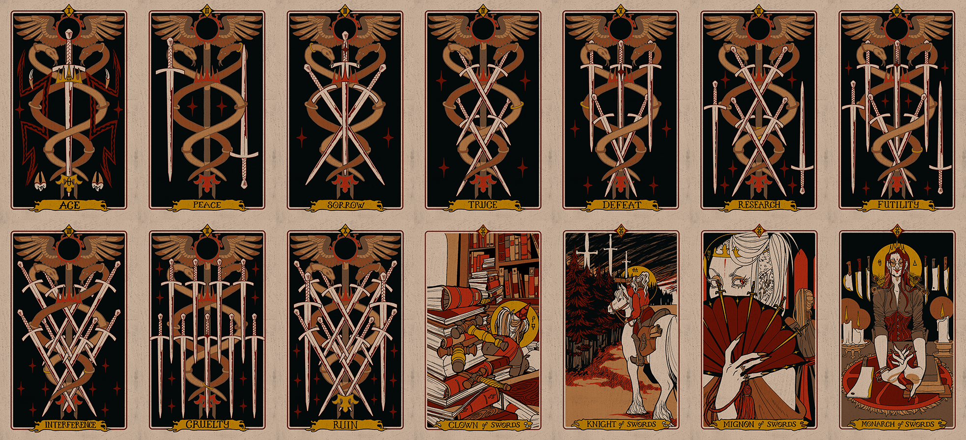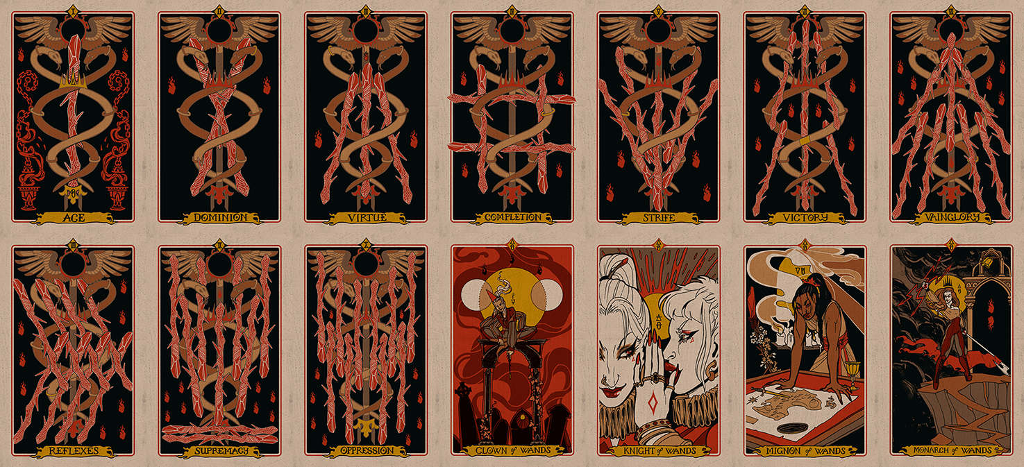 The second edition of the deck is a full deck. The first iteration of this deck had no cleaning done to it at all: all the linework was exactly as it sat in Lucian’s sketchbook. This version is much cleaner, crisper, and well-balanced, the colours stronger and sharper. Only eight colours are used throughout: black, ivory, raw sienna, burnt sienna, burnt umber, crimson, burgundy and gold.