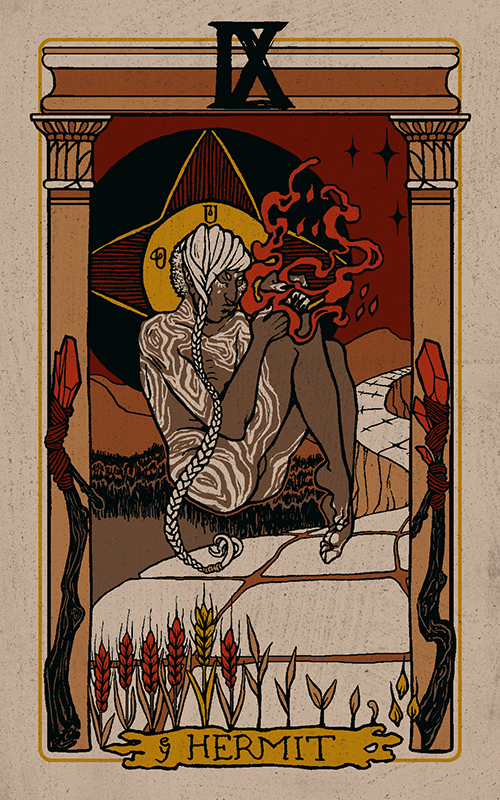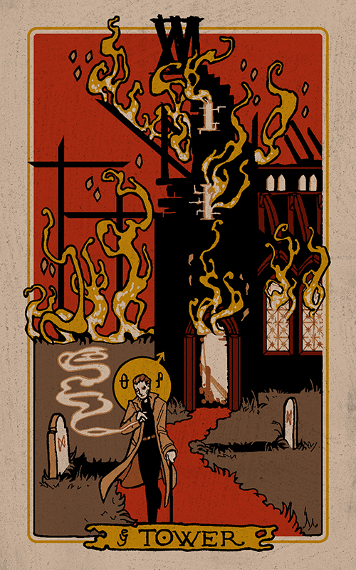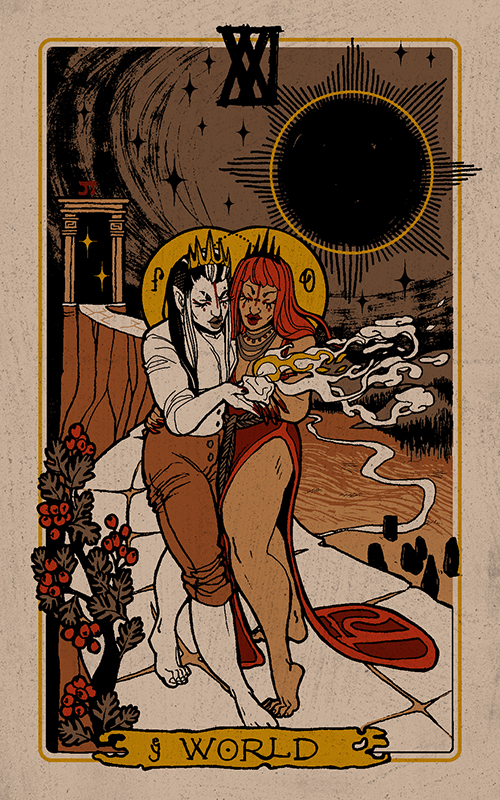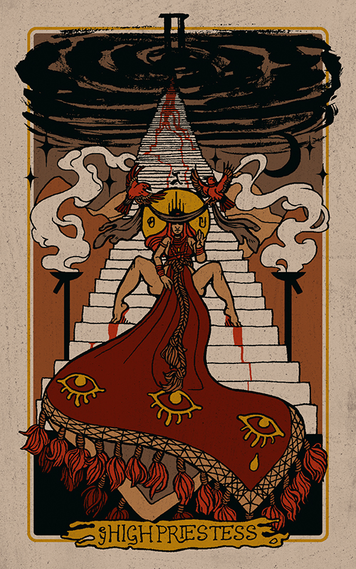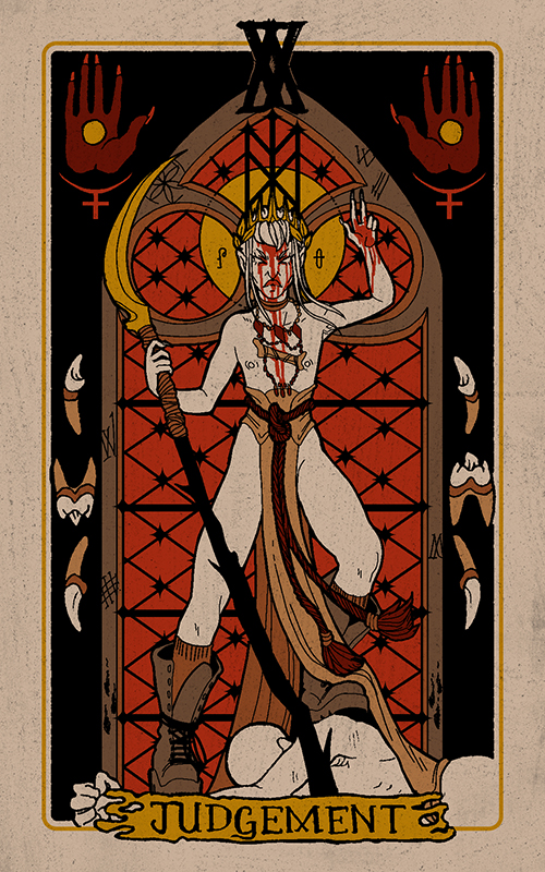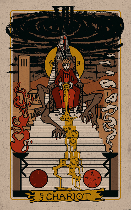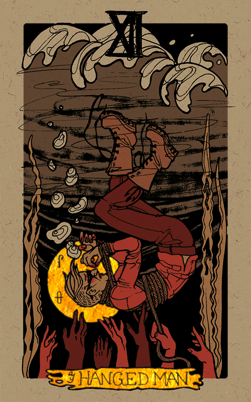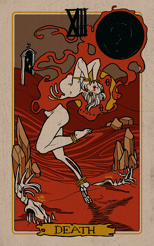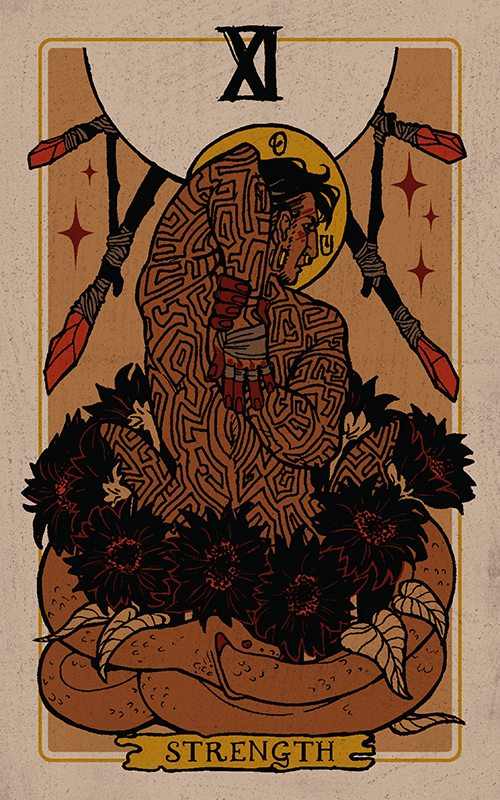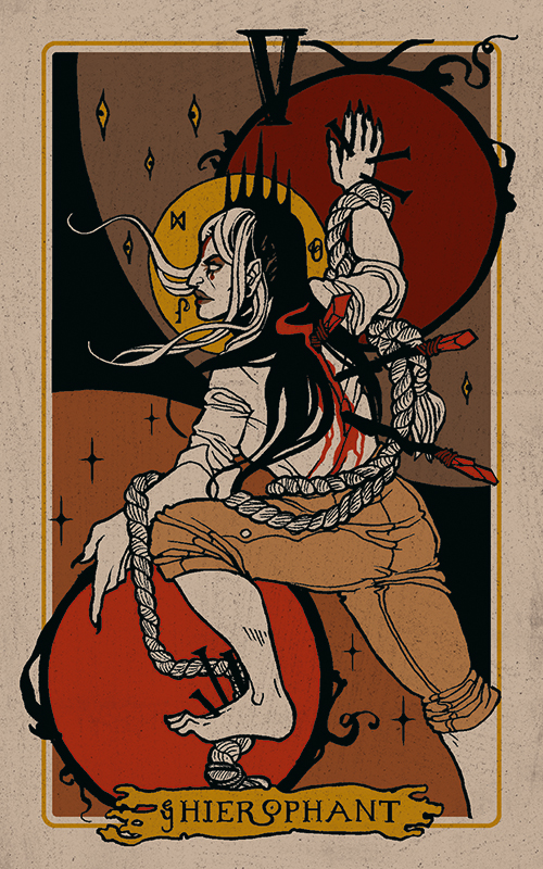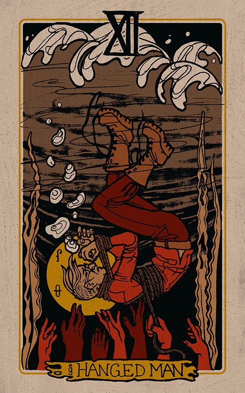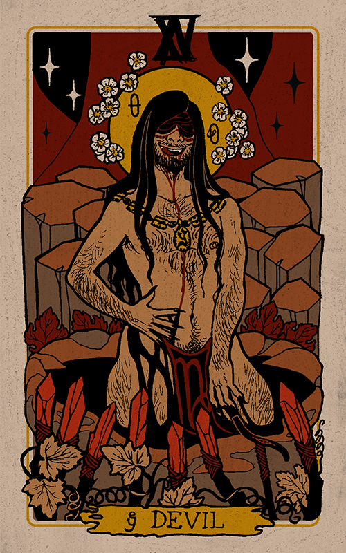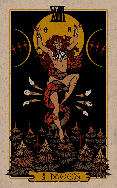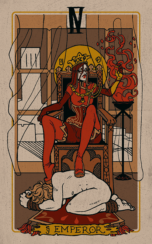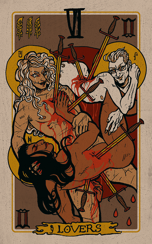 The second edition of the deck is a full deck. The first iteration of this deck had no cleaning done to it at all: all the linework was exactly as it sat in Lucian’s sketchbook. This version is much cleaner, crisper, and well-balanced, the colours stronger and sharper. Only eight colours are used throughout: black, ivory, raw sienna, burnt sienna, burnt umber, crimson, burgundy and gold.