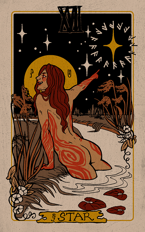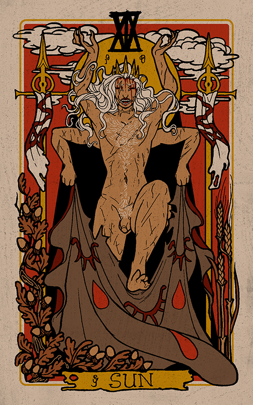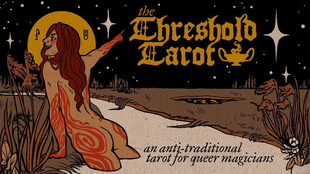 The Threshold Tarot is Lucian’s fully-realised 78-card deck. It has been sort of half his life in the making from idea to result. The figures in it are real people that inhabit his internal world, and the symbolism has been worked out from the guiding principles of tarot as set out by Aleister Crowley in the Book of Thoth. The resultant deck is as fresh as a Spring morning. The symbolic language used within is informed by a lifetime of personal magickal and devotional practice. Lucian listened to a solid diet of Trepaneringsritualen, Lingua Ignota, Of The Wand And The Moon, Rich(ard) Dawson, The Body and Coil while he produced the deck, and this is evident in the resultant artwork. The deck feels earthy, dirty, touched by the divine madness of Dionysus, and is absolutely stuffed with queers.